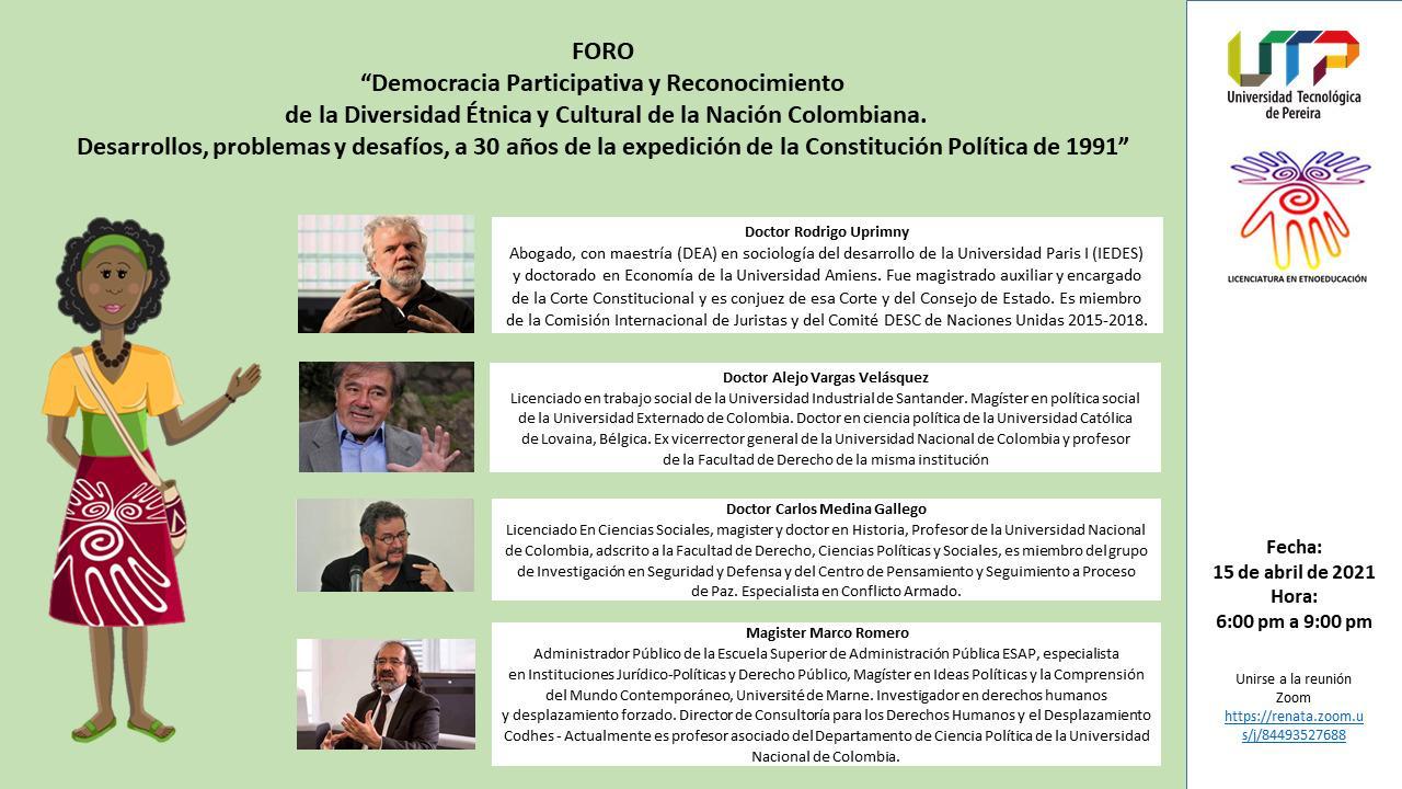 15 de abril a las 6:00PM se realizará el foro: «Democracia Participativa y Reconocimiento de la diversidad Étnica y Cultural de la Nación Colombiana»…